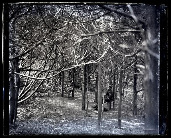 Glass negative showing Marriott C. Morris' brother Samuel Buckley Morris wearing a suit and hat sitting in a grove of slender trees near the Morris family home Avocado. The thin branches of the trees weave together forming a thick canopy above him. Elliston Perot Morris bought property in Sea Girt, N.J. in 1875, where he built the summer home Avocado after designs by Quaker architect Hibberd Yarnall. Morris left Avocado, named after a Perot family estate in Bermuda, to his daughter Elizabeth Canby Morris in his will. It was sold in 1947 after her death. By 1958 the house had been demolished.