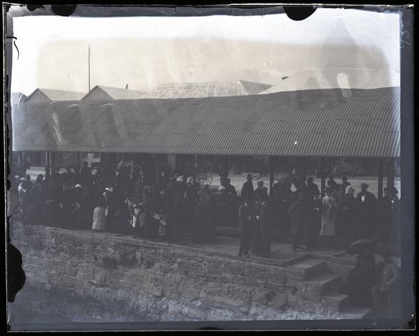Glass negative showing a crowd of people gathered at the edge of a stone wharf at Bermuda. Stairs lead down to the water and a pavilion covers the dock. Horse-drawn carriages wait in the background.