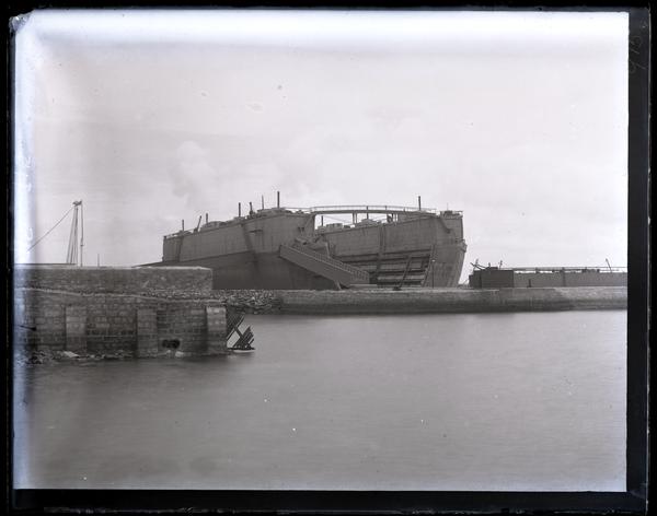 Glass negative showing a large wooden dry dock at Ireland Island with two curved sides, an opening in the middle and a staircase leading up to the top. The structure is located on a dock jutting out into the water. To the left is a low stone wall and the mast of a sailing ship visible behind it.