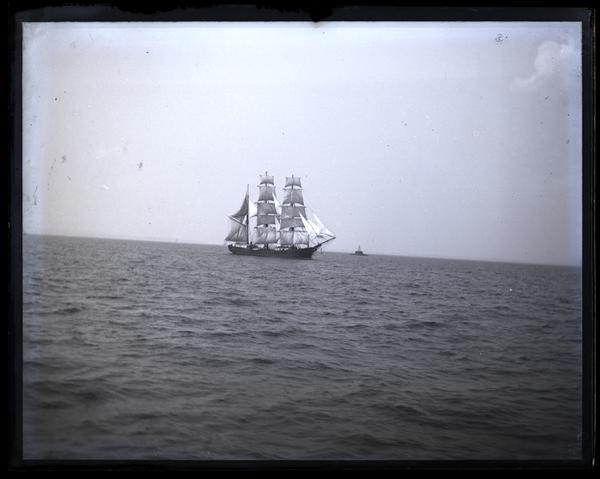 Glass negative showing a tall sailing ship with three masts and multiple sails sailing in New York Bay. There is a bouy floating behind the ship near the horizon line.