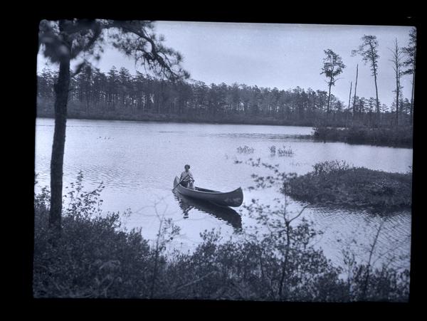 Film negative from a series of photographs taken by Morris during his excursion to Brown Mills, N.J. with the Photographic Society of Philadelphia. Shows a woman and a dog in a canoe on an unidentified river. The woman paddles with an oar around a small island in the middle of the river. The Photographic Society of Philadelphia was founded in 1860 to promote the techniques and art of photography. Morris was a member of the Society by 1885.
