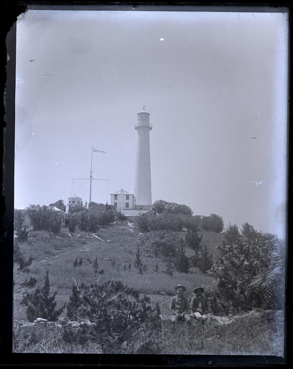 Glass negative showing Gibbs' Hill Lighthouse located on a hill. Two boys sit on a low stone wall at the bottom of the hill. The landscape is filled with trees and other foliage. Gibbs' Hill Lighthouse was built in 1844 by the Royal Engineers. It was made of cast-iron and used mercury to revolve its lense until 1904.