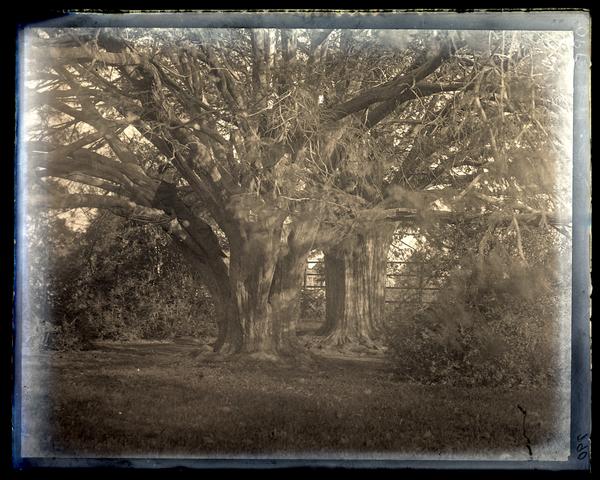 Glass negative showing two large yew trees with thick trunks surrounded by other foliage at Haddon Hall. A fence is visible through the leaves in the background. Haddon Hall is named after Elizabeth Haddon (1680-1762) who immigrated to the United States in 1701 to manage property her father had bought in the colonies, later Haddonfield. In 1702, she married John Estaugh (d. 1742), a Quaker missionary. The yew trees in her garden were brought over from England circa 1713.