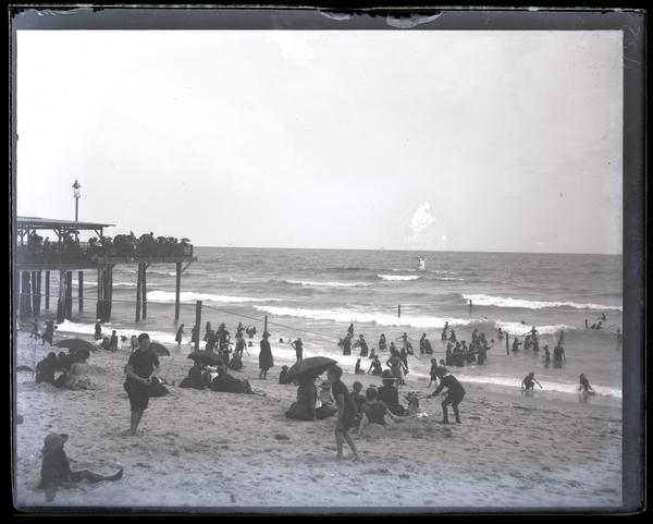 Glass negative showing a group of people on the beach at Asbury Park, N.J. Some swim in the water, others rest in the sand, and others stand on the pier extending over the ocean to the left. Many of the people wear bathing costumes. Asbury Park was developed in 1871 as a residential resort by James A. Bradley (1830-1921), a New York brush manufacturer. The town was named for Francis Asbury (1745-1816), the first American bishop of the Methodist Episcopal Church. It was once home to the famous indoor amusement park Palace Amusements, the site of the original Tillie mural depicting two grinning faces.