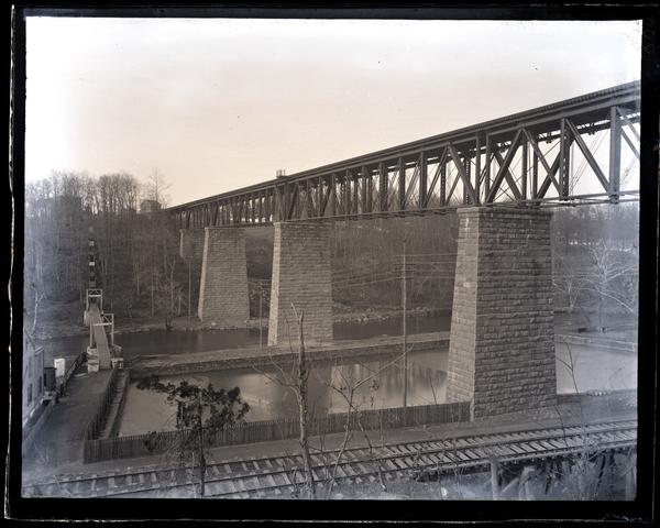 Glass negative showing a bridge constructed from large brick pillars supporting a trestle spanning Brandywine River. A railroad track runs next to the river. Telephone lines also traverse the river up to a small building at the top of a hill on the left.