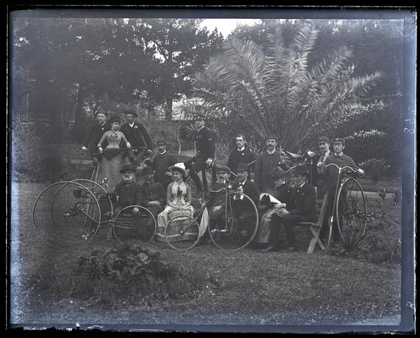 Glass negative showing a group of men and women in a garden behind the Hamilton Hotel. Some sit, some stand, and others lean against their bicycles.