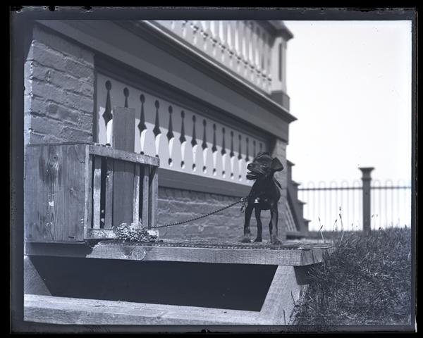 Glass negative showing Bonnie, a small black dog, standing on a steps next to the porch of the Morris family home Avocado. She has her mouth open, and a leash with a bell around her neck.