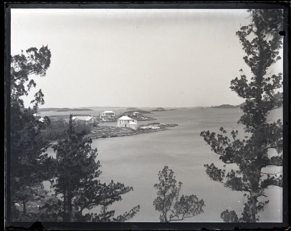 Glass negative showing a view of a shoreline at Paget seen from a distance from between two clusters of trees. The shoreline curves, creating a small inlet which is surrounded by buildings.