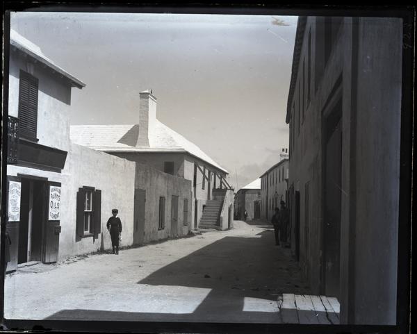 Glass negative showing Water Street at Saint George island. The buildings cast shadows on the road and a man stands next to the window of a building on the left. Two other men stand in the doorway of a building on the right further down the road. The building on the left has a sign reading "Paints, Oils [...] Cement."