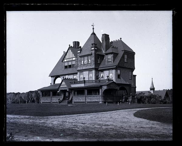 Glass negative showing Charles Wright's multi-story brick home with a manicured lawn. The three-story house has a porch, central tower, and crenellated ridgeline. The roof of another building is visible behind the houes, partially obscured by trees. A dirt road runs to the right of the house. Charles Wright began the construction of this house in 1885. Phoebe Wright was not directly related to him, but lived here until the construction of her own house in 1890.