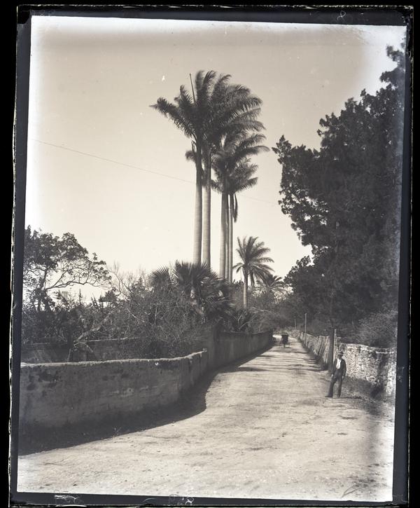 Glass negative showing a dirt road with stone walls on either side. Tall palm trees tower over the road in the distance. A man stands in the foreground and a hores drawn carriage drives down the road in the background.