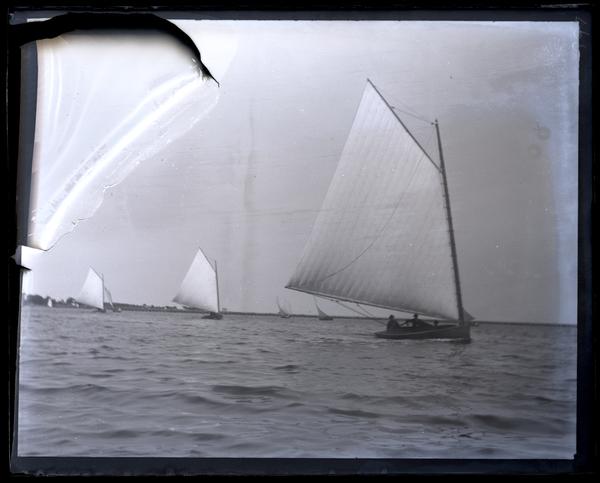 Glass negative showing various sailboats traveling across Manasquan River, a wide river with choppy water. The boat in the foreground carries three people.