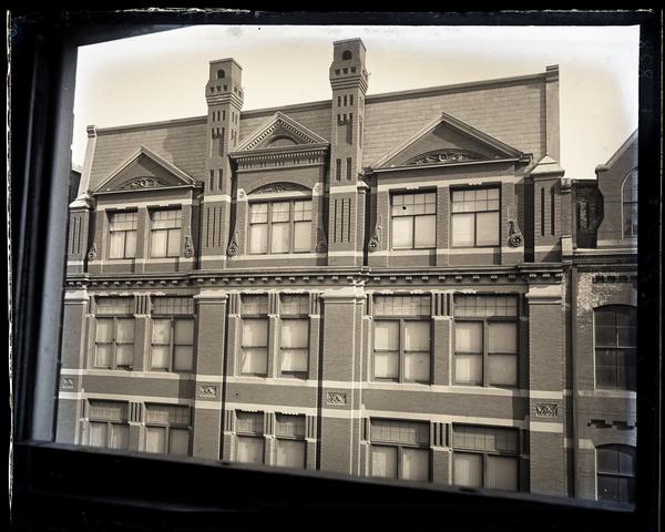 Glass negative showing the upper three stories of Daniel Miller & Co's building in Baltimore. The building is decorated with engaged pillasters, cornices and pediments.