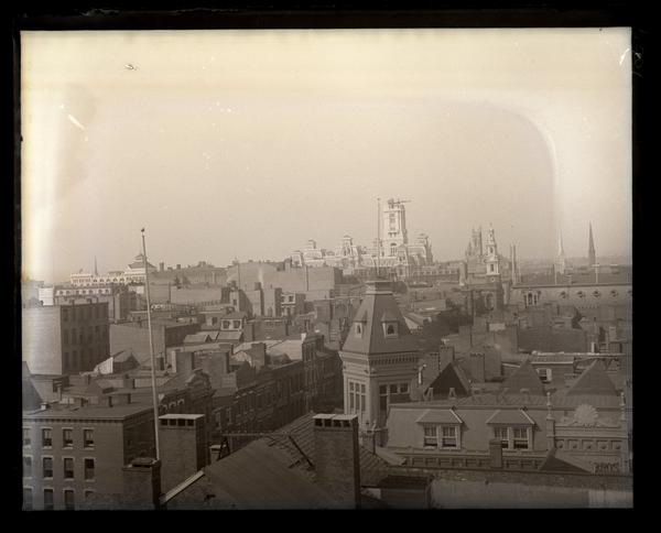 Glass negative showing the Philadelphia cityscape seen from the roof of Elliston Perot Morris' property at 715-719 Arch Street. Buildings of various sizes, signs, and awnings extend toward the horizon with a clear sky above. The large tower of City Hall under construction is visible in the distance.