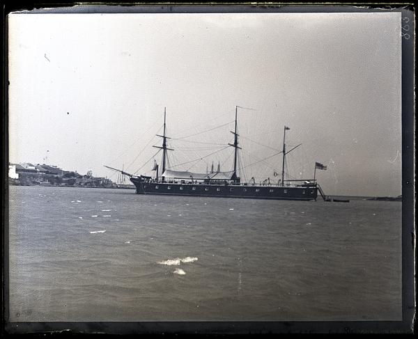 Glass negative showing a large ship with three masts sailing off the coast of a port city on Ireland Island. The ship is seen from a distance across the water.
