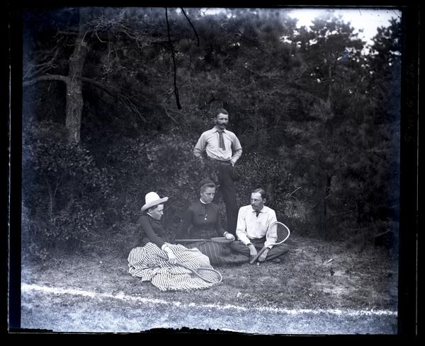 Glass negative showing Marriott C. Morris and his sister Elizabeth Canby Morris, Shober Kimbar, and Anne Emlen posed in the grass in front of thick foliage and trees. The women and Kimber sit on the ground each holding a badminton racquet. Marriott Morris stands behind the group with his hands on his hips. The women wear black blouses with patterend skirts. The men wear long sleeves and short ties.