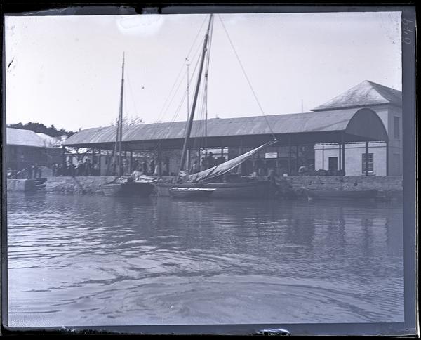 Glass negative showing a sailboat docked at a wharf on Saint George Island seen from across the water. The wharf is full of people and cargo.