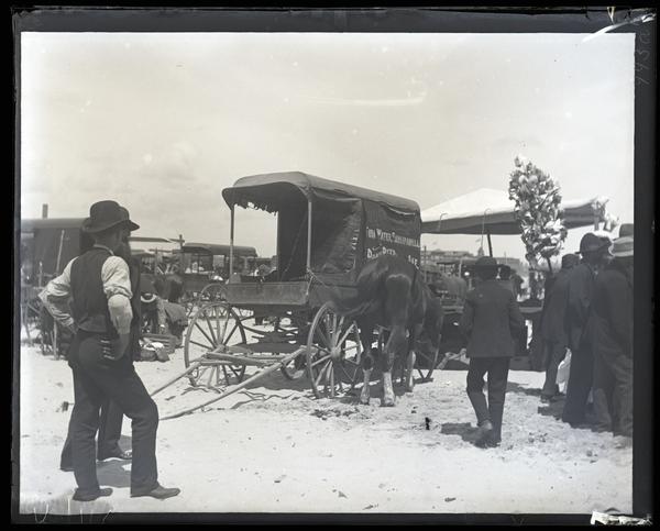 Glass negative showing a group of people on the beach gathered around a carriage with a horse standing next to it during Ocean Day. Stalls, carriages and more people fill the background. Words painted on the side of the carriage read "Soda Water, Sasparilla [...]" Jersey Wash Day, also known as Salt Water Day or Ocean Day, was an annual event held the second Saturday of August near Wreck Pond in Sea Girt. Farmers living twenty to thirty miles from Sea Girt came to the sea to spend a day bathing and celebrating. The tradition, begun before 1853, stopped around the 1930s.