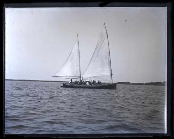 Glass negative showing a two-masted sailboat carrying a large group of people on Manasquan River. Buildings on the far shore are barely visible in the distance across the water.