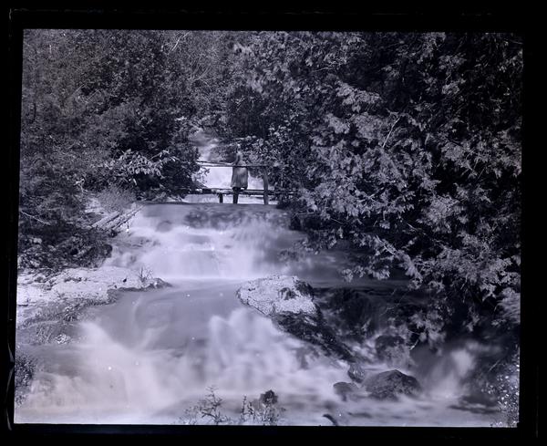 Glass negative showing Marriott Morris' aunt Anna Tatnall Canby on a wooden bridge crossing over the cascading Cedar Creek. Canby stands in the center of the bridge in profile. Either bank is lined with trees, their barnches extending over the water.