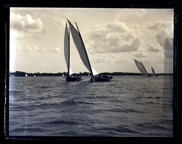 Glass negative showing two sailboats, each carrying groups of people, racing on the Manasquan River. Other boats sail in the background and the far shore is lined with trees.