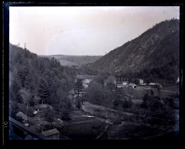 Glass negative showing a a trestle railroad bridge crossing the Catawissa Creek in a wooded valley. Various buildings stand on either bank.