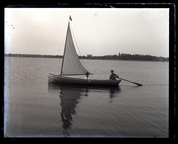 Glass negative showing a small sailboat carrying Marriott Morris' cousin William Marriott Canby and Miss Moss on Wreck Pond. Canby in the back of the boat holds an oar and the boat's sail is reflected in the calm water.
