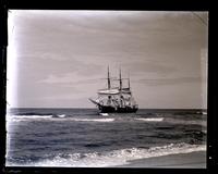Glass negative showing the "Civitas Canaria," a large sailboat on the ocean at Manasquan, N.J. The boat has three masts and is seen from the beach across choppy water.