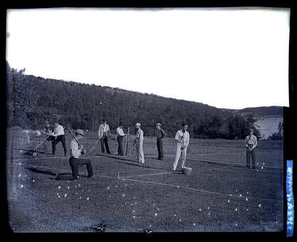 Glass negative showing a group of men setting up a tennis court. Working with various tools, the men suspend the net, draw out lines and tend to the grass.