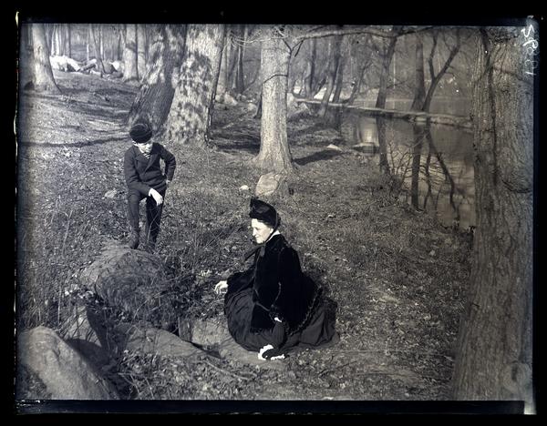 Glass negative showing Marriott Morris' mother Martha Canby Morris and a boy, possibly Morris' cousin William Marriott Canby Jr., resting near Brandywine Creek. Morris sits in the grass near some rocks while the boy stands with one knee bent leaning on the rocks. Morris wears a velvet shawl and hat.