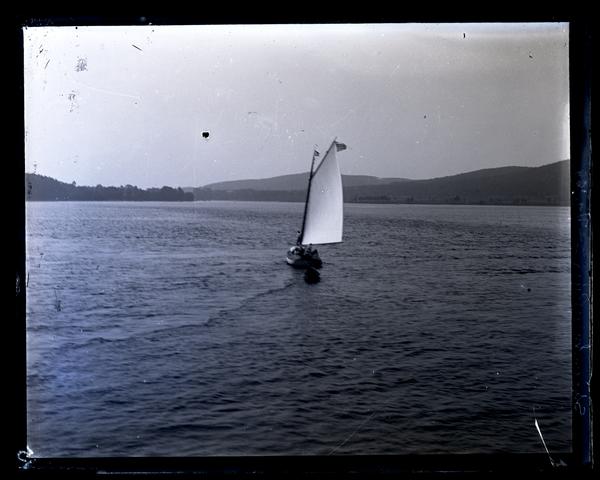 Glass negative showing a sailboat traveling down Shrewsbury River seen from a distance across the water. The sailboat travels toward a far shore lined with trees.