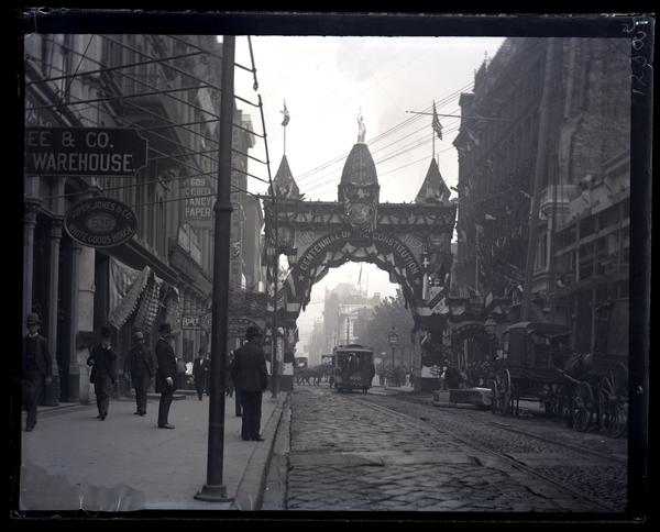 Glass negative showing a view of Chestnut Street spanned by an elaborate archway that reads, "Centennial of the Constitution." People crowd the sidewalks on either side of the street and trolley wires crisscross overhead. The buildings on the left have signs for [Megarg]ee & Co. [Envelope] Warehouse at 617, Super Jones & Co. White Goods House at 615, and Chas Beck Fancy Paper and Cardboards at 609. The Centennial Anniversary of the framing and creation of the Constitution was held on September 16-18, 1887 in Philadelphia. Organized by representatives from the various states and territories, the festivities included a military display, orations and concerts, and an industrial parade.