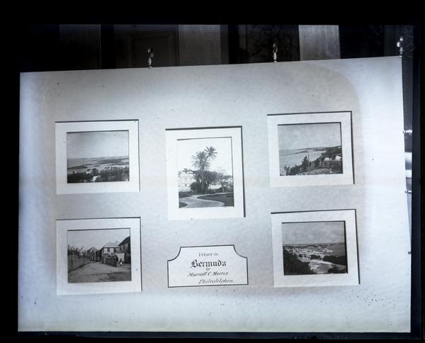 Glass negative showing a frame holding five photographs taken by Marriott Morris in Bermuda. The photographs depict palm trees, a city street, and views of the ocean. The plaque in the center of the frame reads "Views in Bermuda by Marriott C. Morris Philadelphia."