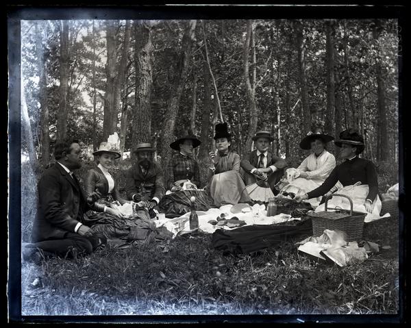 Glass negative showing Marriott Morris' father Elliston P. Morris, sister Elizabeth Canby Morris, mother Martha Canby Morris, and possibly third cousin Helen Morris, with Joseph Bunford Samuel, Fannie Garrett, Fred Strawbridge, and Mary Taylor gathered for a picnic in the woods. The group sits in a semi-circle around a blanket filled with food and a picnic basket. The men wear three-piece suits while the women wear long, high-necked dresses and hats.