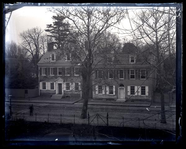 Glass negative showing the Deshler-Morris House at 5442 Germantown Avenue and Schaeffer's house, seen from across a brick road. The houses are each two-storys with shuttered windows on the first floor and steps leading up to the entryway. Two large trees stand on the opposite side of the street. David Deshler built the original four-room summer cottage on this Germantown lot in 1752, adding the three-story front addition in 1772. The house was sold to Col. Isaac Franks in 1792 after Deshler’s death. President George Washington rented the home for the duration of the yellow fever epidemic of 1793 and the summer of 1794. Elliston and John Perot purchased the house in 1804, selling it to Elliston’s son-in-law Samuel B. Morris after his death in 1834. The house stayed in the possession of the Morris family for over a century, when Elliston P. Morris donated the house to the National Parks Service in 1948. The name was officially changed to the Germantown White House in 2009. : First called The Green, Market Square was established from land originally owned by James De la Plaine as early as 1703. As a center of community activity, Market Square contained not only market stalls but also the prison and stocks. Samuel B. Morris planted many of the Square’s original trees. Prominent buildings situated around the Square include the Deshler-Morris House, the German Reformed Church, and the Fromberger-Harkness House.