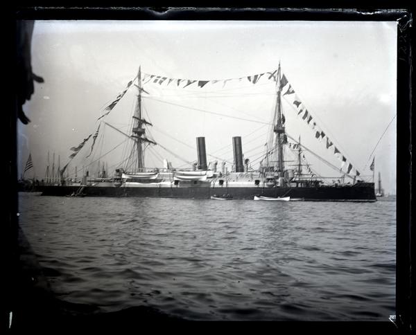 Glass negative showing the U.S.S. Atlanta, a large ship with two masts and two smokestacks on the Delaware River at the Centennial celebrations. A string of flags flies from one end of the ship to the other between the masts. Two small rowboats travel tethered next to the ship. The Centennial Anniversary of the framing and creation of the Constitution was held on September 16-18, 1887 in Philadelphia. Organized by representatives from the various states and territories, the festivities included a military display, orations and concerts, and an industrial parade.