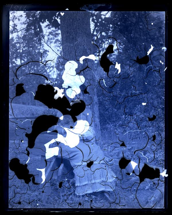 Glass negative showing Pattie Mellor sitting in the grass beneath a tree at Manasquan. N.J.