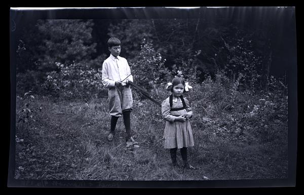 Film negative showing Marriott C. Morris' children Marriott Canby Morris Jr. and Janet Morris walking in a field at Pocono Lake. Marriott Morris Jr. wears glasses and short pants. He holds a stick in his right hand and two strips of fabric in his left hand. The fabric wraps around Janet Morris' torso like a harness. She wears ribbons in her hair and looks at the camera. The Pocono Lake Preserve was pioneered by a group of Quakers, including Isaac Sharpless, who camped in the area in 1904. In 1908, this group bought the property from the Pocono Mountain Ice Company and designed it as a basic, rustic campground.