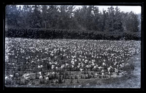 Glass negative showing a field of Easter lilies bordered by a row of leafy shrubs. Trees grow behind the field.