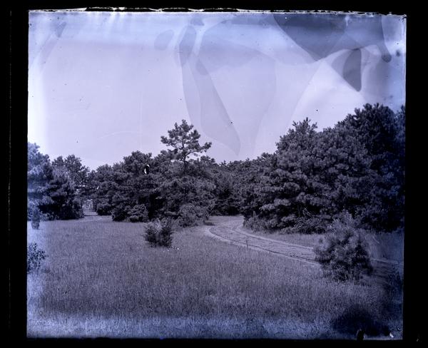 Glass negative showing a road curving to the right through a grassy field in Crescent Park. Trees grow to the right of the road and in the background.