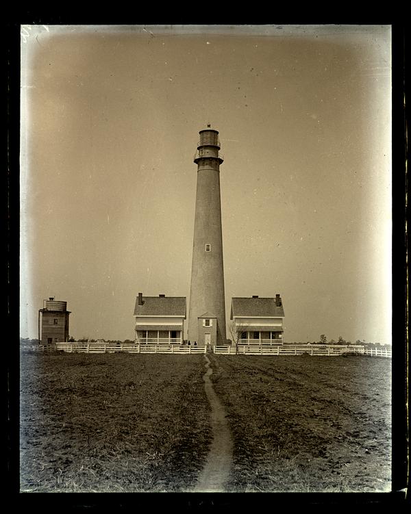 Glass negative showing Cape May Lighthouse, designed by army engineer William F. Raynolds (1820-1894), with various outbuildings. A path leads toward the lighthouse across a wide field surrounded by a wooden fence.