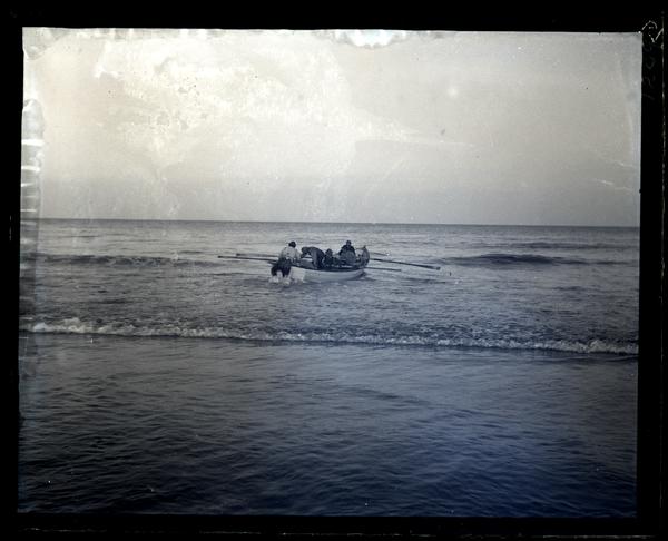 Glass negative showing Capt. David N. Curtis' fishing boat carrying a group of men sailing out over the breakers in the ocean at Sea Girt. Four oars extend over the water from inside the boat.