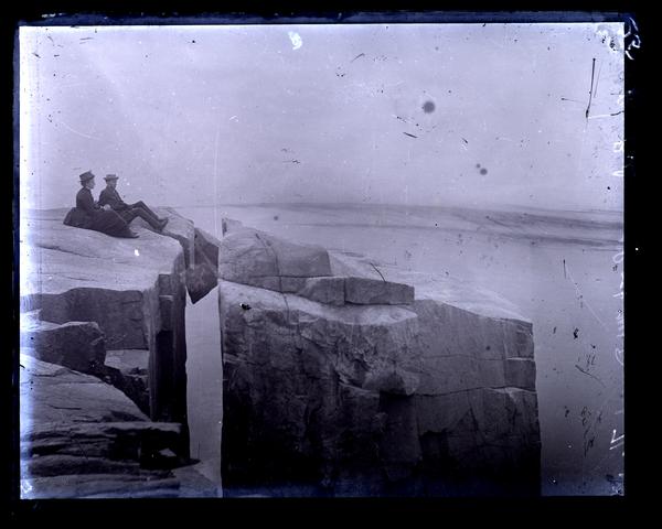 Glass negative showing a man and a woman sitting on a jagged rock outcropping looking over a valley at Mount Desert Island. The man wears a suit and hat and the woman wears a dark dress and hat. Mount Desert Island, the largest island off the coast of Maine, was popularized in the mid-19th century by Hudson River School painters as a nature retreat. From the late 19th century to around the 1930s the Island was a tourist destination for the social elite.
