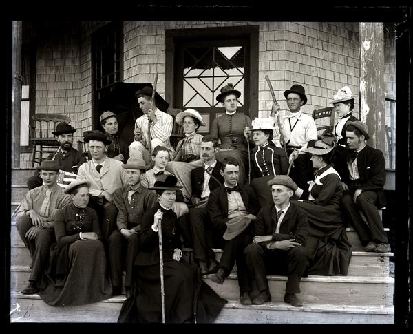 Glass negative showing a large group of people sitting on the steps of a hotel at Mount Desert Island. Some in the group hold walking sticks while a man in the back row holds a parasol. The men wear shirts and ties, some with jackets, and all but two wear hats on their heads. The women wear long, high-necked dresses and hats. Mount Desert Island, the largest island off the coast of Maine, was popularized in the mid-19th century by Hudson River School painters as a nature retreat. From the late 19th century to around the 1930s the Island was a tourist destination for the social elite.