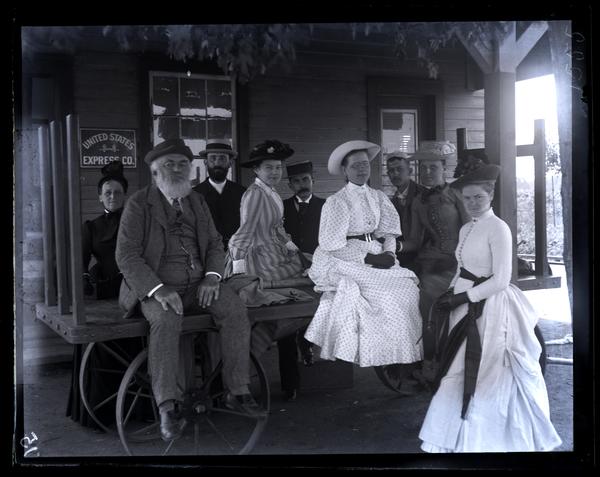 Glass negative showing Mr. Price, Eli Price, Fred Baker, Gertrude Mellor, and Whitall Nicholson, and Marriott C. Morris' mother Martha Canby Morris, sister Elizabeth Canby Morris, third cousin Ellen Morris, and possibly his third cousin Helen Campbell Morris, posed on the platform at a train station. They sit and stand in front of a building with a sign that reads, "United States Express Co." The women wear long patterened dresses and hats while the men wear three-piece suits and hats.