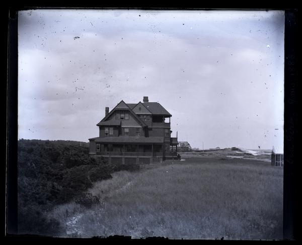 Glass negative showing Margaret Antoinette Oglesby's multi-story house with a wraparound porch and a balcony on the third floor. Dune grass grows in front of the house and trees grow behind while the ocean is visible in the distance on the right. Oglesby’s husband Joseph built their house in 1887, but died before it was completed. She and her son continued to live in the house until his death in 1963. The house later burned down.