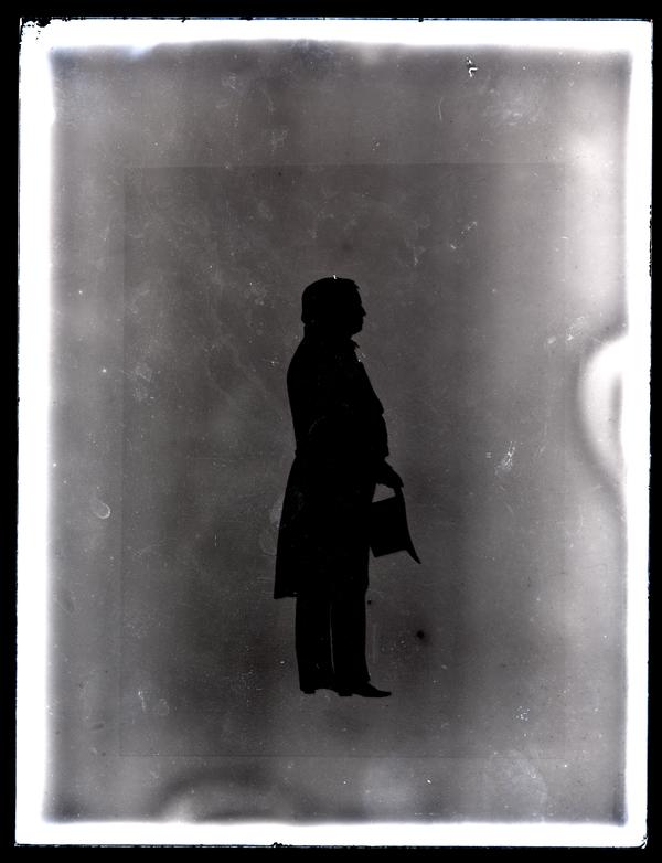 Glass negative showing a silhouette of a man, possibly Marriott Morris' grandfather Samuel B. Morris, standing in profile holding a hat in his hands.