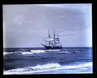 Glass negative showing the "Civitas Canaria," a large sailboat on the ocean at Manasquan, N.J. The boat has three masts and is seen from the beach across choppy water.