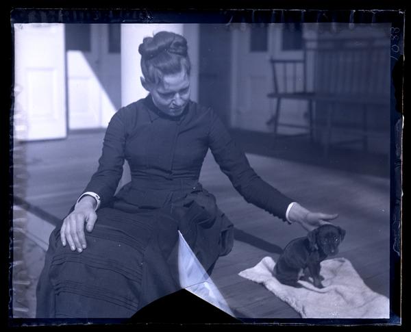 Bess & dog, Nemo, on back porch, [Deshler-Morris House, 5442 Germantown Avenue]. Dog is about 6 weeks old [graphic].