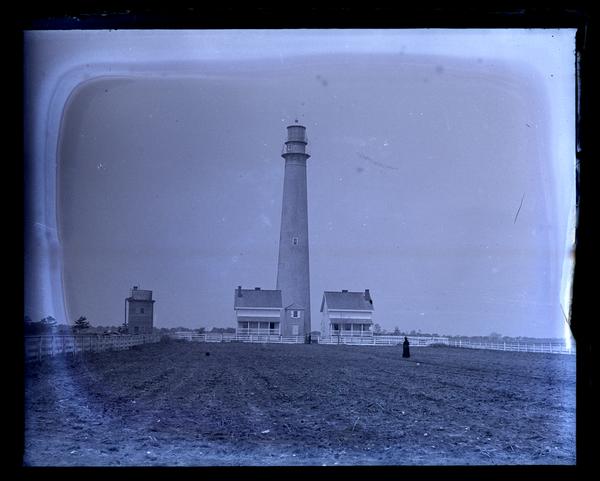 Glass negative showing a distant view of the Cape May Lighthouse, designed by army engineer William F. Raynolds (1820-1894), and its various outbuildings. A wide field surrounded by a fence is visible in the foreground. Marriott C. Morris' father Elliston P. Morris and sister Elizabeth Canby Morris stand next to the fence close to the lighthouse while his mother Martha Canby Morris stands in the field.